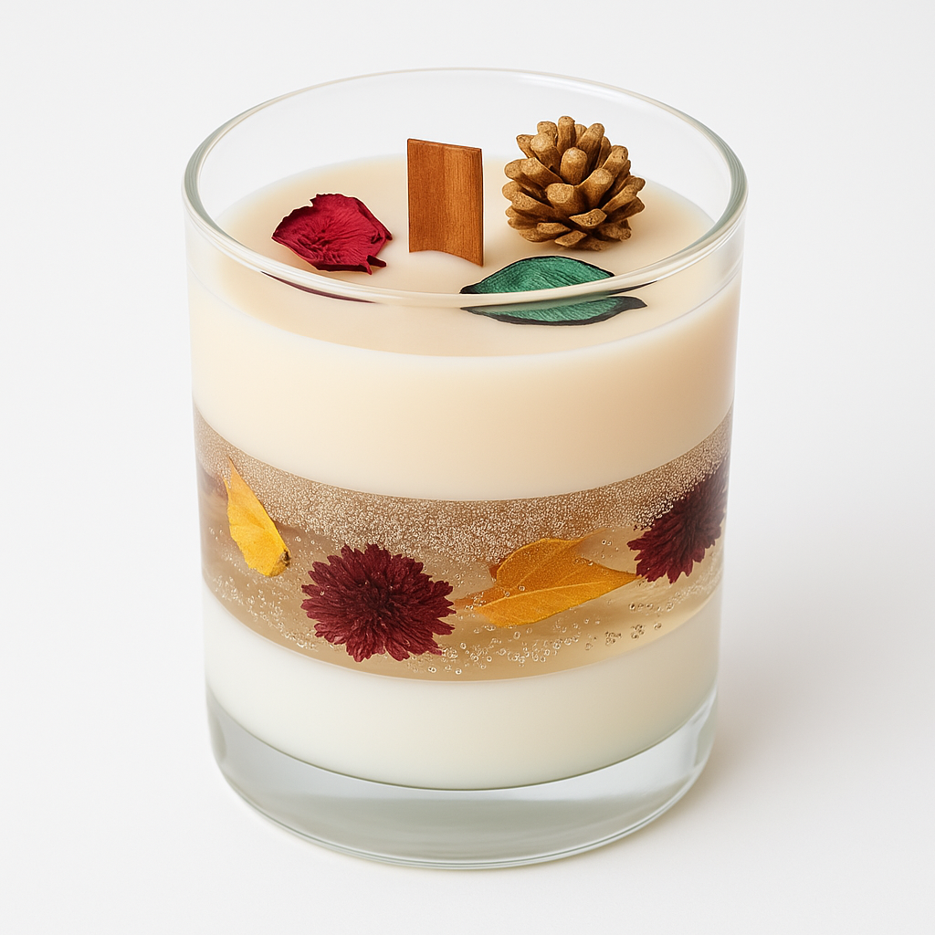 Gefertigt aus nachhaltigem Sojawachs und klarem Gelwachs, entsteht ein faszinierender Schicht-Look, der durch liebevoll platzierte Natur-Elemente wie Zapfen und Blätter veredelt wird.